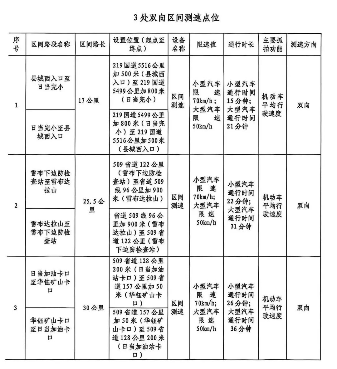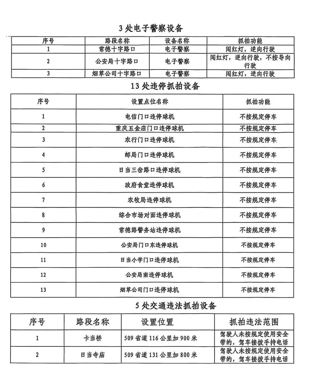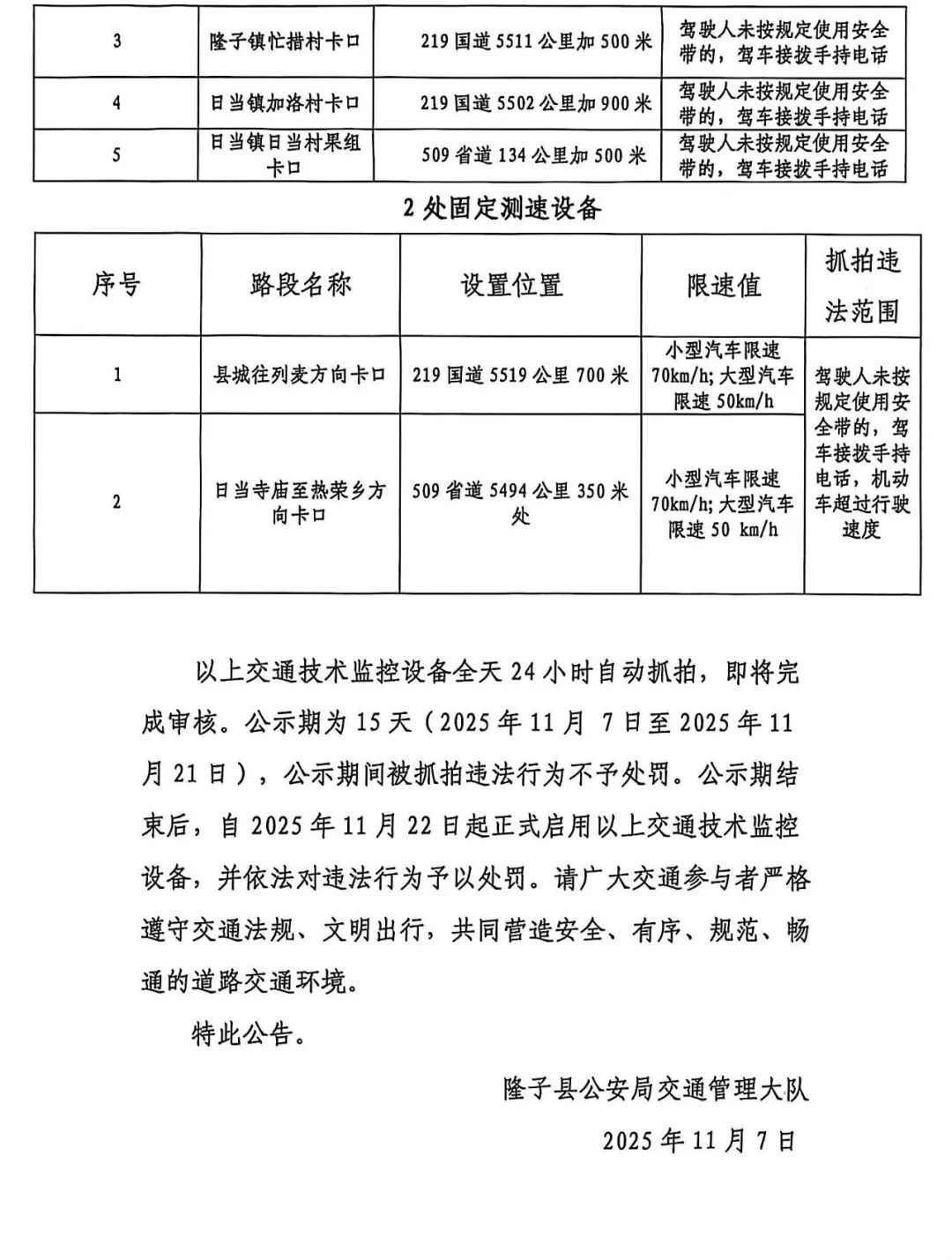 为进一步规范道路交通秩序、有效预防减少道路交通事故,保障人民群众生命财产安全,根据《中华人民共和国道路交通安全法》、《中华人民共和国道路交通安全法实施条例》以及《道路交通安全违法行为处理程序规定》等相关法律法规要求。隆子县公安局交通管理大队结合辖区道路交通实际情况,决定在我县辖区国省干道及城区范围内启用双向区间测速设备3处、电子警察设备3处、违停自动抓拍设备13处、交通违法行为抓拍设备5处、固定测速设备2处。现根据《道路交通安全违法行为处理程序规定》相关之规定,对上述设备设置点位及相关信息予以公告。