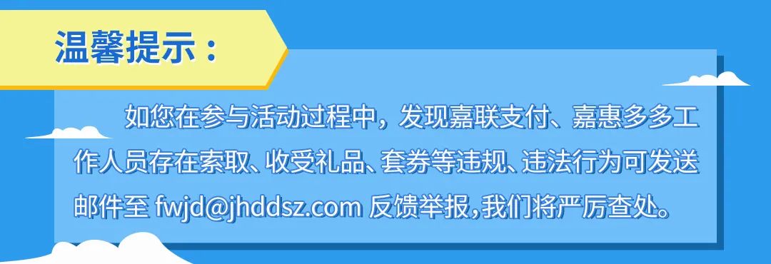 活动期间,如对消费补贴有疑问或发现违规行为,可通过嘉惠多多在线客服咨询/举报。