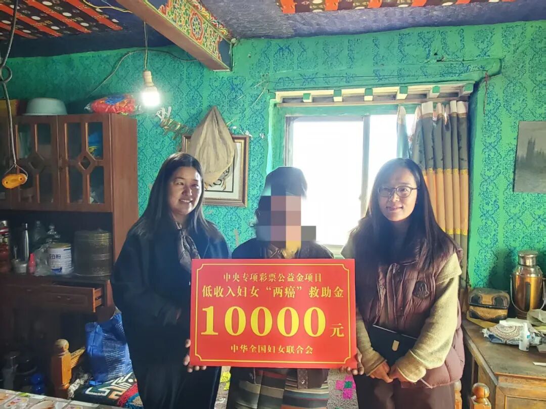 工作人员专程入户走访,为对日当镇雪村宫颈癌患病妇女、隆子镇新巴村乳腺癌患病妇女等3人,每人兑现了“低收入妇女两癌救助”中央专项彩票公益金1万元,为患病妇女送去了党和政府的关爱与温暖。