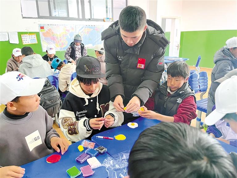 图为支教队员余梓鑫和孩子们一起完成课堂小游戏。
