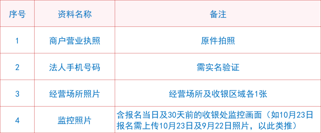 5.新入网商户:报名成功后需向工作人员补充提供法人身份证、收款账户、门头照、场所照、收银台照等入网资料。