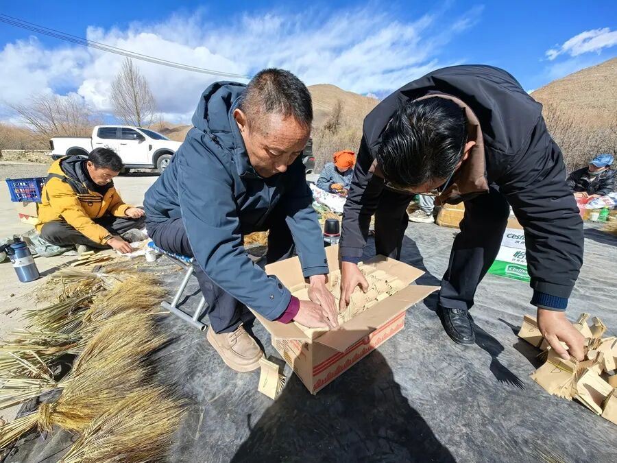2025年,市农业技术推广中心与隆子县农业农村局联手启动黑青稞提纯复壮项目,让这一千年作物迎来“科技赋能”的新生。“搓穗是提纯复壮的关键环节,既要把籽粒完整分离,更要守住优质种源的纯度。”从今年9月的田间选穗到11月的集中搓穗,项目团队步步精细。30余名技术人员顶着高原烈日,用3天时间从百亩田间筛选出2.7万穗符合“植株健壮、穗型规整、无病虫害”标准的优质种穗;进入11月,又历时4天开展集中搓穗工作,采用人工轻揉慢搓的方式,避免籽粒破损,确保种源品质。“每一粒种子都来之不易,搓穗时要像呵护珍宝一样,才能把好种源的‘最后一道关’。”参与搓穗的隆子县农业农村局技术员边巴扎西说。