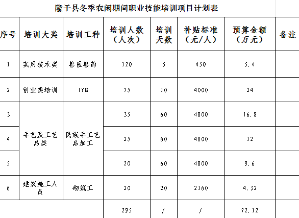 为进一步规范我县农牧民职业技能培训工作,根据《西藏自治区2025年度职业技能培训补贴目录》(藏人社发〔2025〕16号)、《西藏自治区职业技能培训补贴资金使用管理实施细则》(藏人社发〔2025〕22号)、《西藏自治区职业技能培训实操规程(试行)》(藏人社发〔2025〕132号)等相关文件要求,结合我县冬季农闲期间农牧民实际培训需求,决定召开隆子县冬季农闲期间职业技能培训项目评审会,现将有关事项具体公告如下: